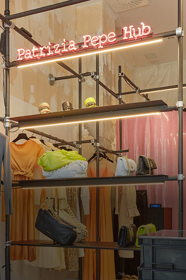 Patrizia Pepe HUBS werden auf bereits vorhandenen Flächen eingerichtet, ohne jeglichen architektonischen und strukturellen Eingriff. Das zur Verfügung stehende Layout wird mit einer Reihe von kontinuierlichen und mobilen modularen Elementen personalisiert, in einem zirkulären Rhythmus, in dem jede Komponente recycelt und repliziert werden kann, ohne zusätzliche Produktionsverbräuche und -abfälle zu verursachen.