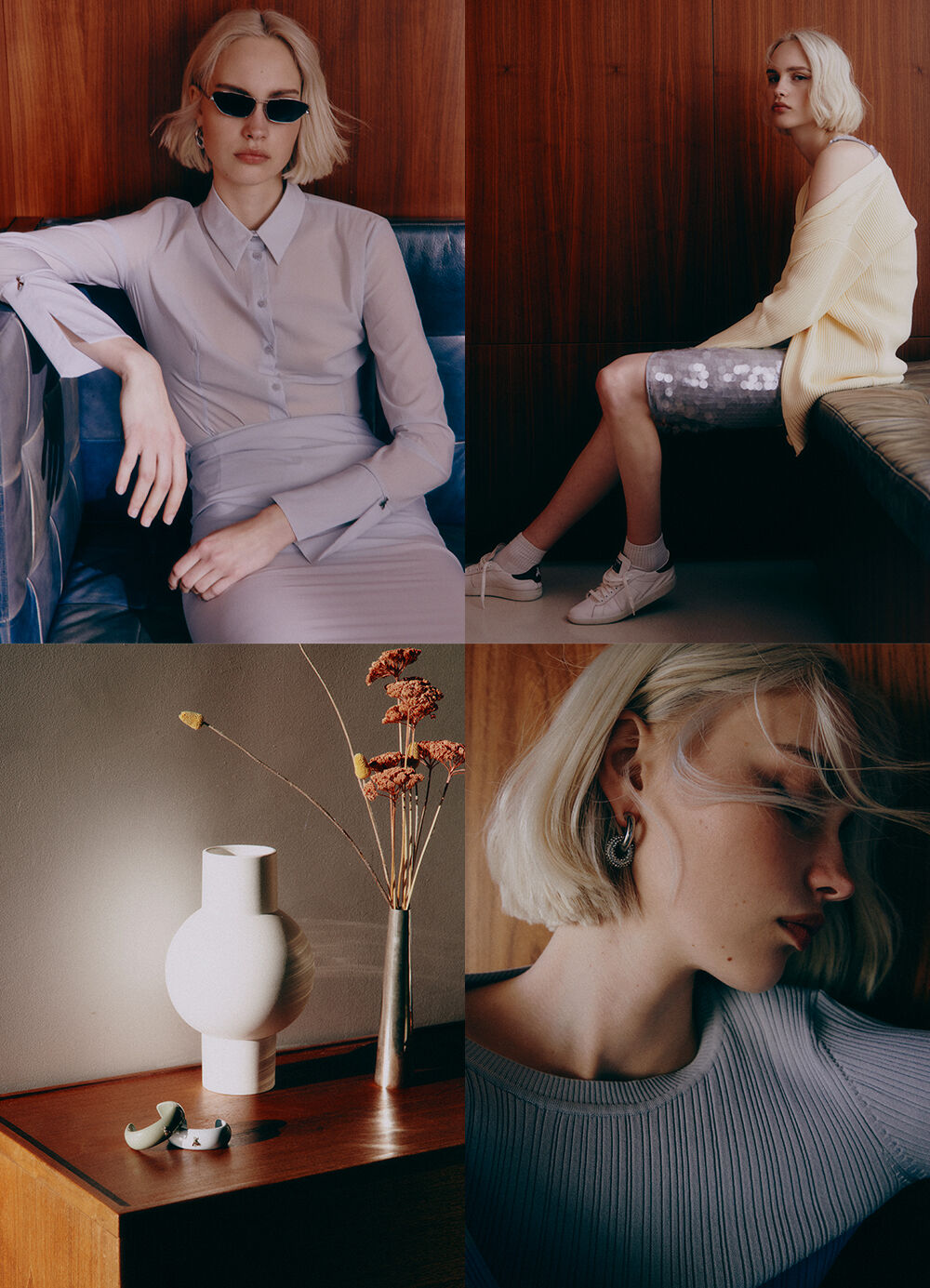 As day melts into evening, accessories take center stage to completely transform the look - with sparkling crystal jewellery, lived-in sneakers, minimalist leather pumps, and versatile bags that can be carried by hand or over the shoulder.