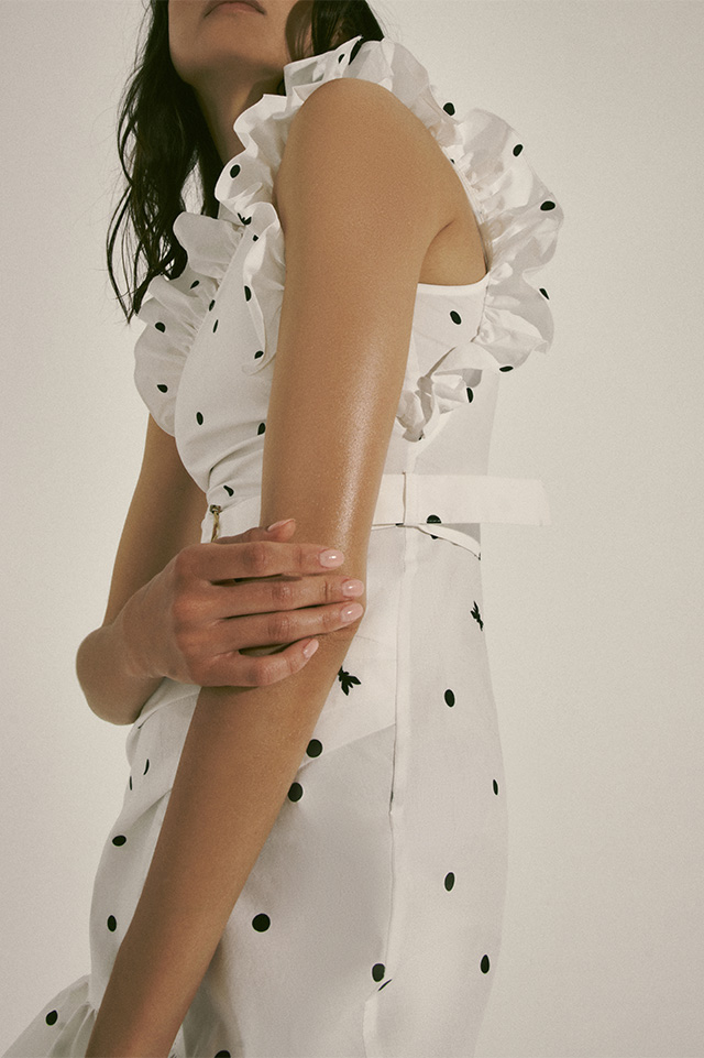 Fluid and light silhouettes enlivened by flounces, ruches and emphasized volumes.